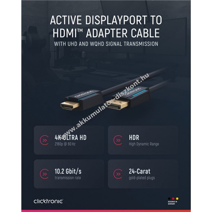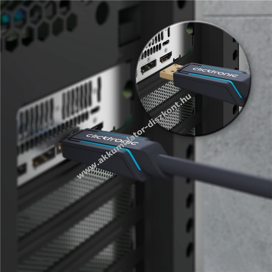 Clicktronic kiemelt figyelmet fordít a tartósságra és stabilitásra 10 év garanciával. A minőségi kábel háromrészes PVC és ABS csatlakozóval védi a kábelt a töréstől. nikkelezettt érintkezők és tiszta réz vezetők biztosítják a kiváló hang- és képátvitelt otthoni mozihoz és játékhoz. 4K 60 Hz és WUXGA 60 Hz felbontás támogatásával kristálytiszta kép és hang érhető el. 10,2 Gbit/s maximális adatátviteli sebesség HDR támogatással. Beépített jelerősítő megakadályozza a jelveszteséget, így hosszabb távon is megbízható. Mechanikus csatlakozózár biztosítja a stabil kapcsolatot. A jel iránya a nyilak szerint a számítógéptől a kijelző felé kell, hogy mutasson.