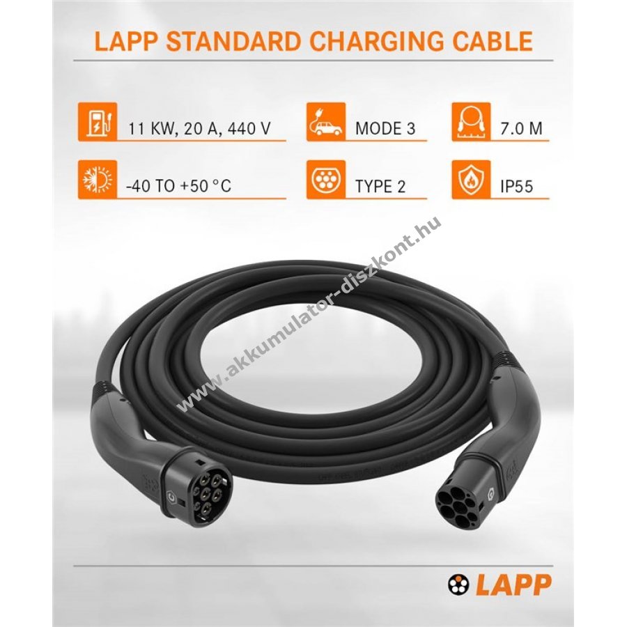LAPP töltőkábel Typ 2 csatlakozóval egyszerű és gyors töltést biztosít hibrid és elektromos autókhoz akár 11 kW teljesítménnyel. 3-fázisú kábelkialakításával támogatja az 1-fázisú 3,7 kW-os töltést is.