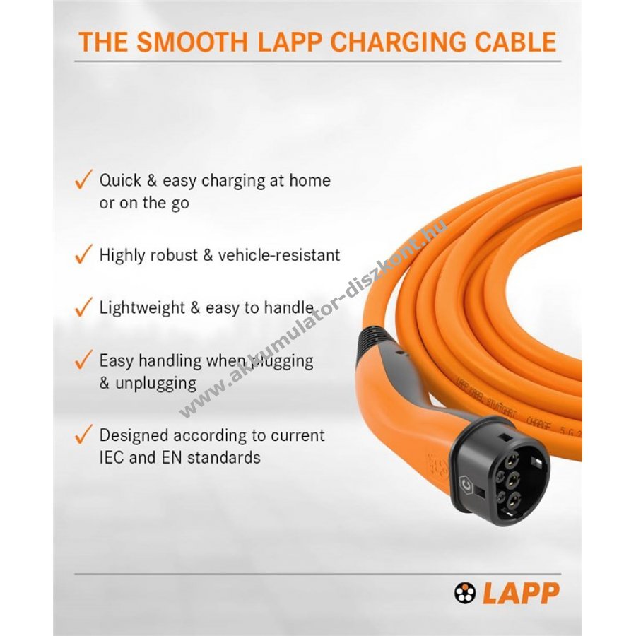 A LAPP MOBILITY standard Typ 2 töltőkábel egyszerű és biztonságos töltést biztosít hibrid és elektromos autókhoz otthon vagy útközben. A kábel csatlakozója könnyen illeszthető az autóra és a töltőállomásra. A töltés a jármű fedélzeti elektronikája által automatikusan indul és fejeződik be.