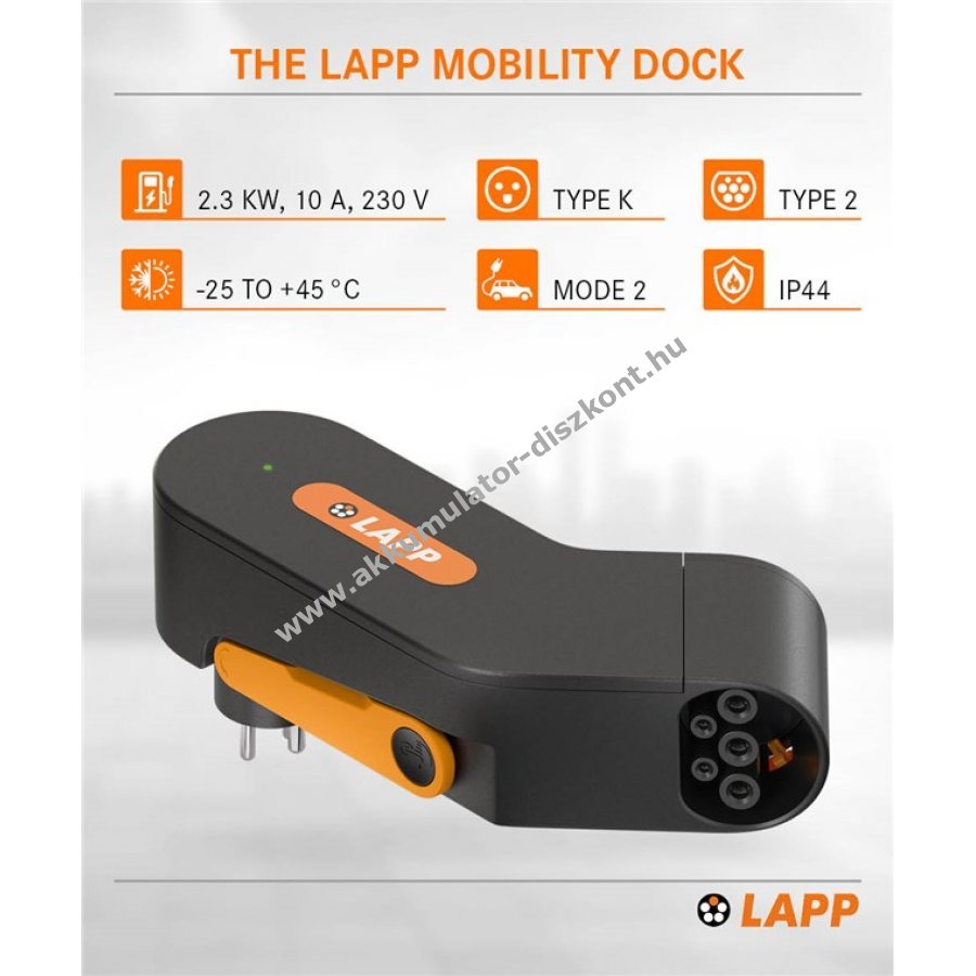 A LAPP Mobility Dock praktikus megoldás elektromos járművek töltésére Dánia területén töltőállomás vagy wallbox nélkül. Ideális vészhelyzeti töltő plug-in hibridek és akkumulátoros elektromos autók számára.
