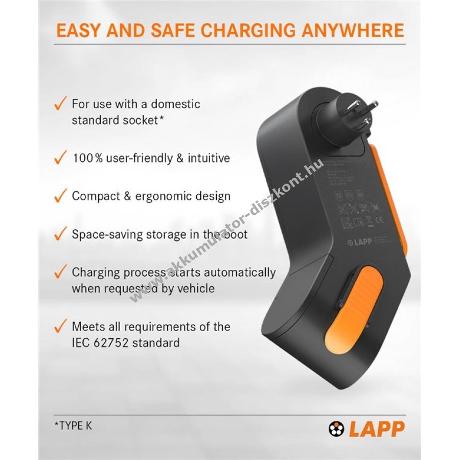 Különösen biztonságos túláram- és túlfeszültségvédelemmel valamint hőmérséklet-ellenőrzéssel a hálózati dugóban és a kábelvezérlő egységben.