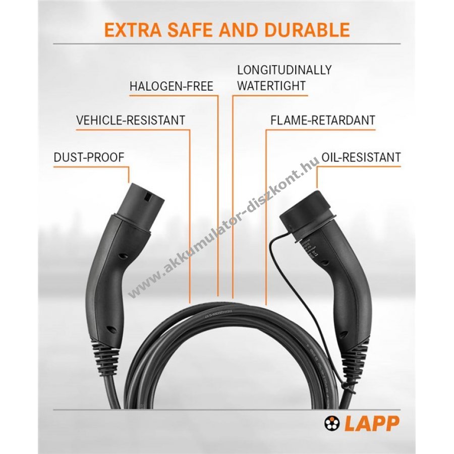 LAPP töltőkábel Typ 2 elektromos és plug-in hibrid autókhoz egyszerű otthoni és útközbeni töltéshez. A kábel csatlakozója az autóra, a dugó a töltőállomásra csatlakozik. A töltés az autó elektronikája által automatikusan indul és áll le. 3 fázisú kialakításával akár 11 kW teljesítményű töltést tesz lehetővé, támogatja az 1 fázisú 3,7 kW töltést is.