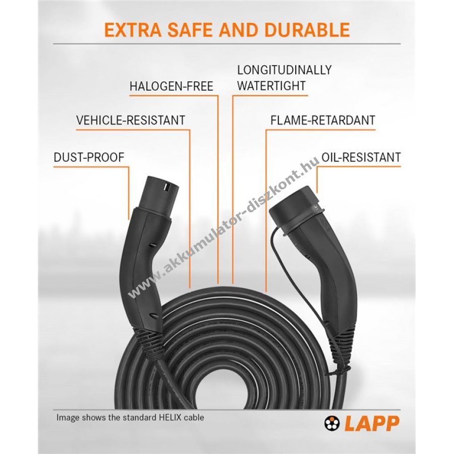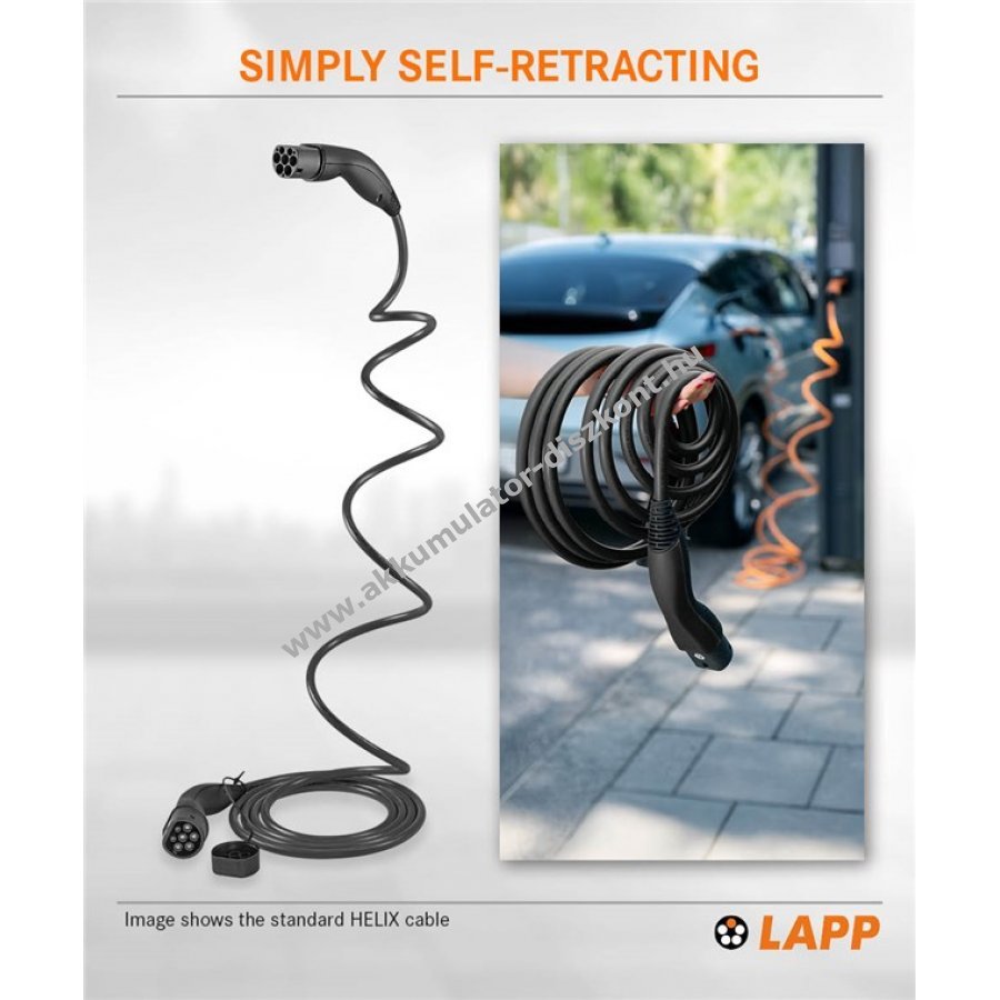 A LAPP HELIX Typ 2 töltőkábel egyszerű csatlakozást biztosít elektromos és hibrid autók töltéséhez otthon vagy útközben. A kábel csatlakozója az autóra, a dugó a töltőállomásra csatlakozik. A töltés automatikusan indul és leáll az autó fedélzeti elektronikája által.