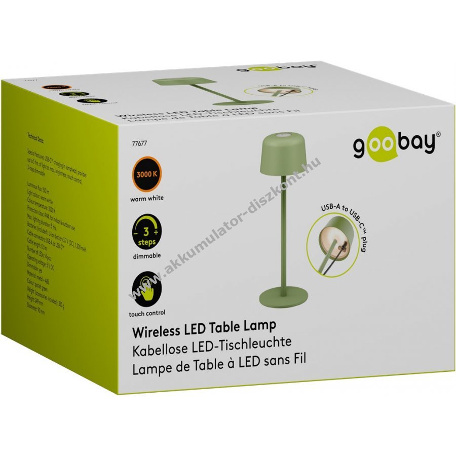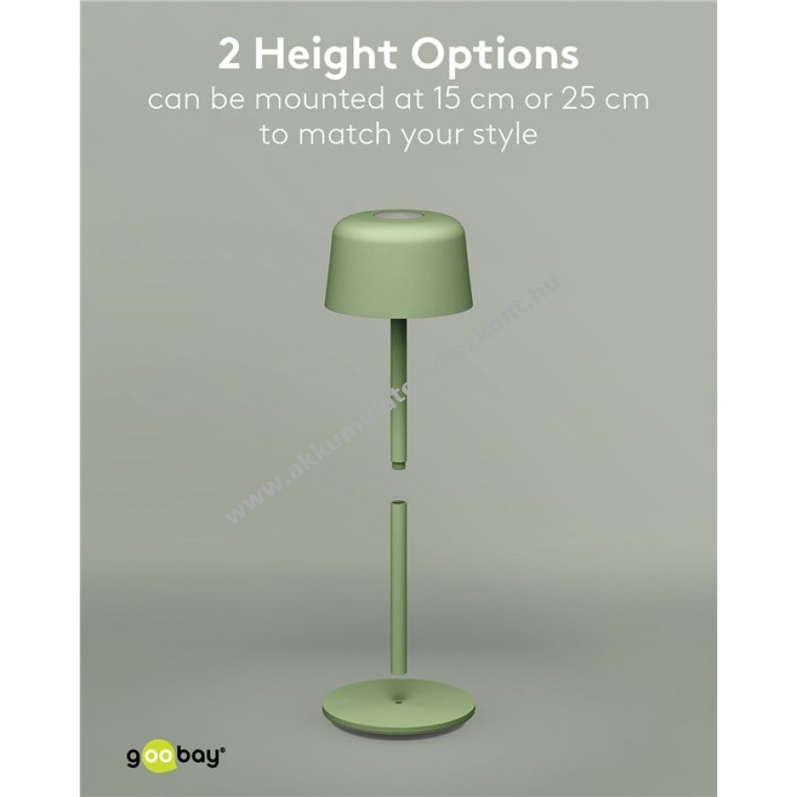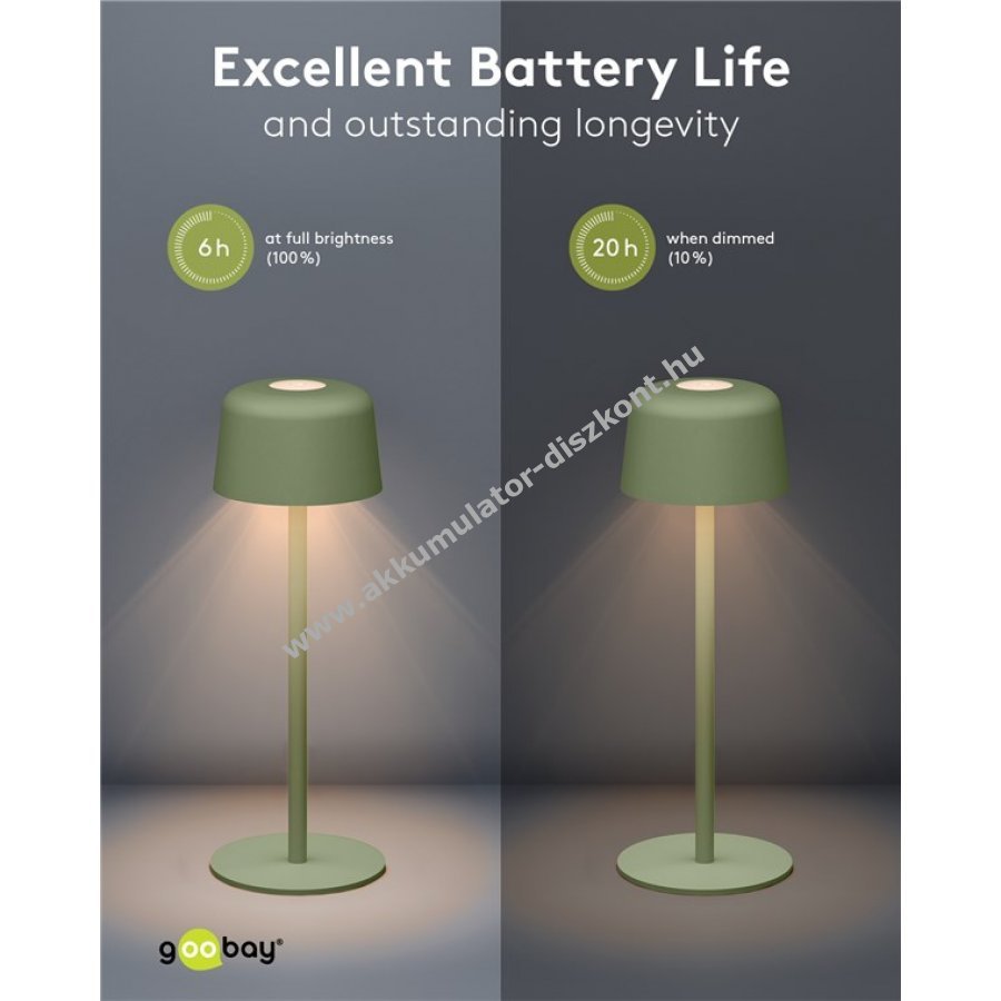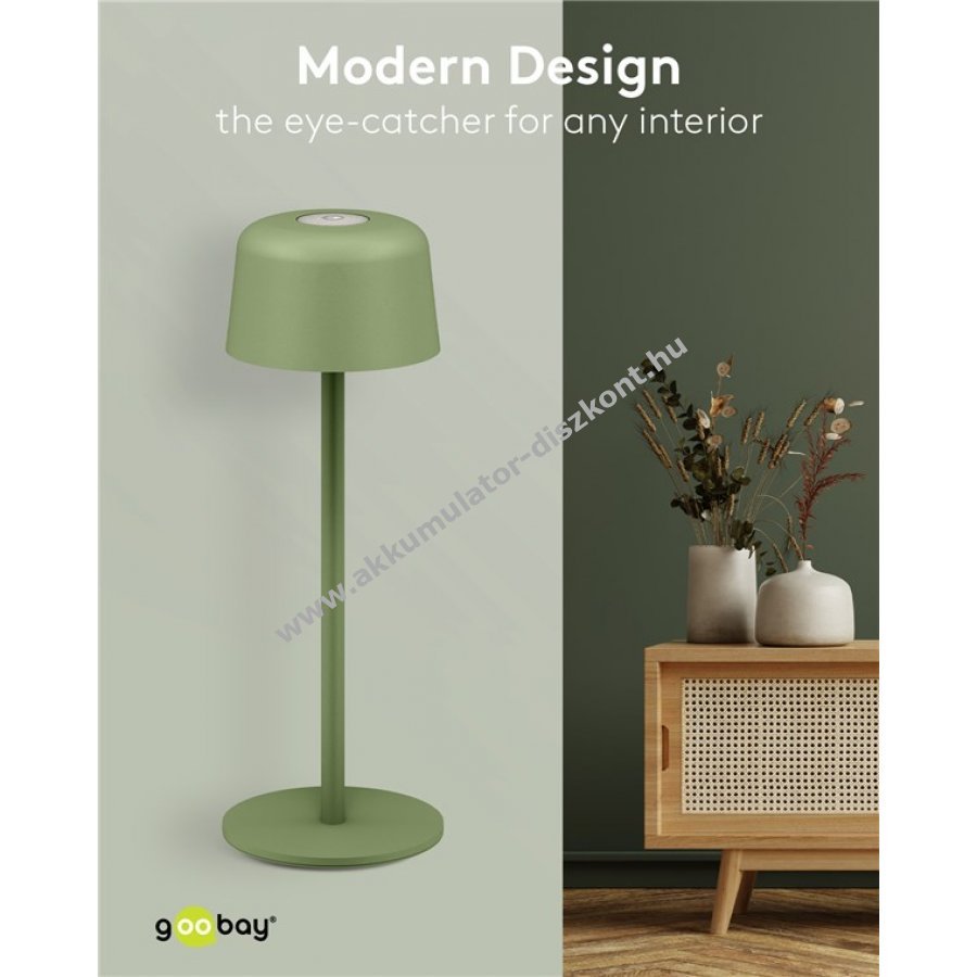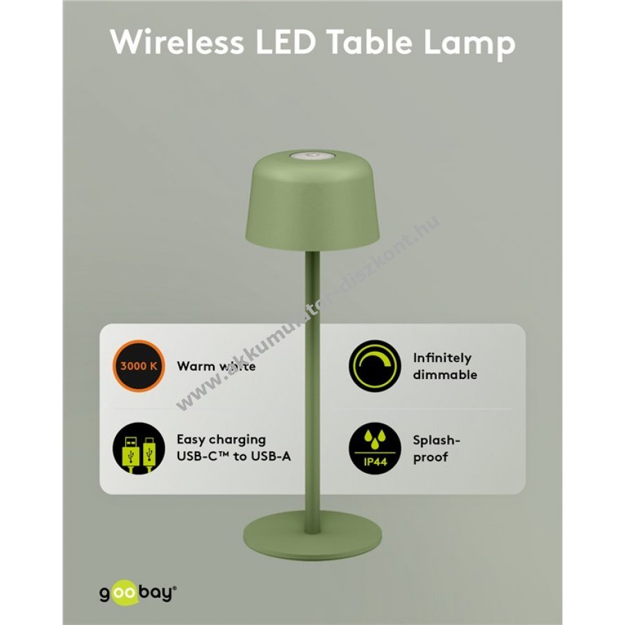 Kompakt, vezeték nélküli Goobay LED asztali lámpa skandináv dizájnnal és masszív fém kivitelben, beépített 18650 Li-ion akkumulátorral, érintésvezérléssel és IP44 védettséggel, hordozható megoldás otthonra, irodába, vendéglátásba vagy kerti rendezvényekre.