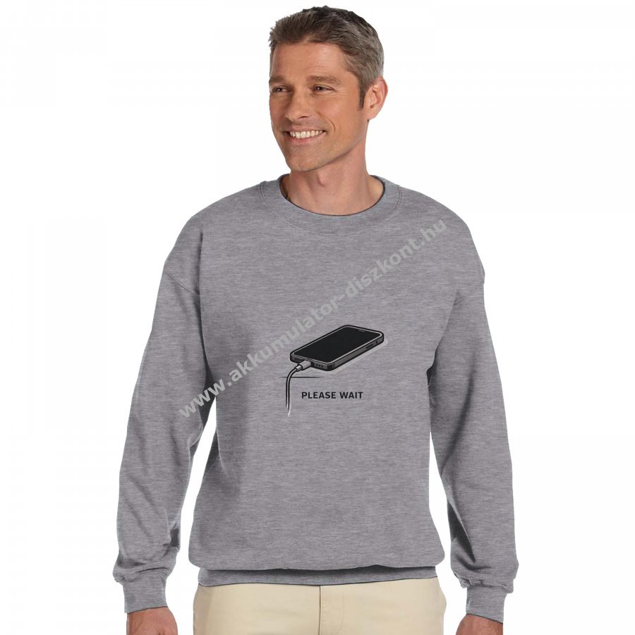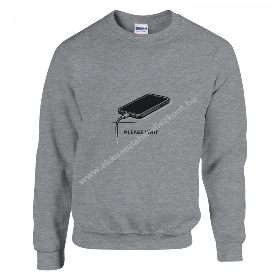 Letisztult, modern megjelenésű szürke pulóver központi elhelyezésű „PLEASE WAIT” grafikával. A töltés alatt álló okostelefon illusztráció finom, humoros utalás a digitális mindennapokra, miközben a design megőrzi a minimalista, könnyen kombinálható összhatást. Ideális választás hűvösebb napokra, hétköznapi viselethez.